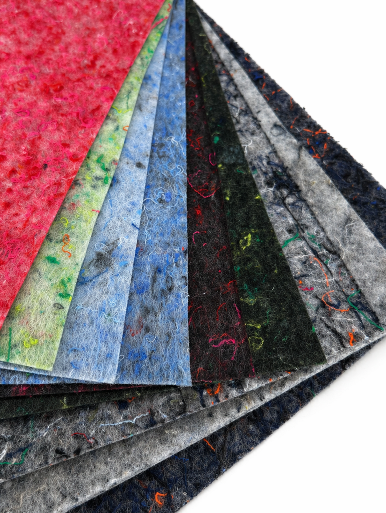 A nonwoven material made from recycled fiber for sound-absorbing panels in commercial and residential spaces.